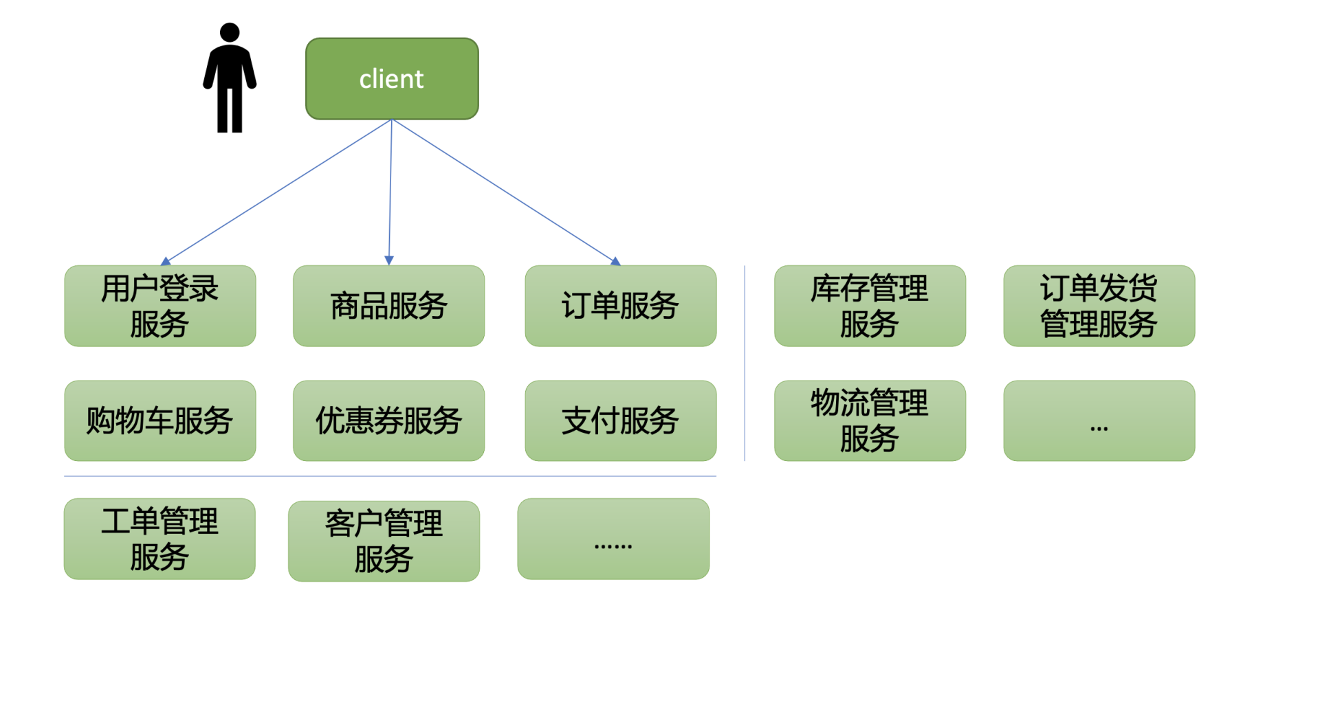 在微服务架构中,每个模块职责更单一、独立部署、开发迭代快,如下图所示。