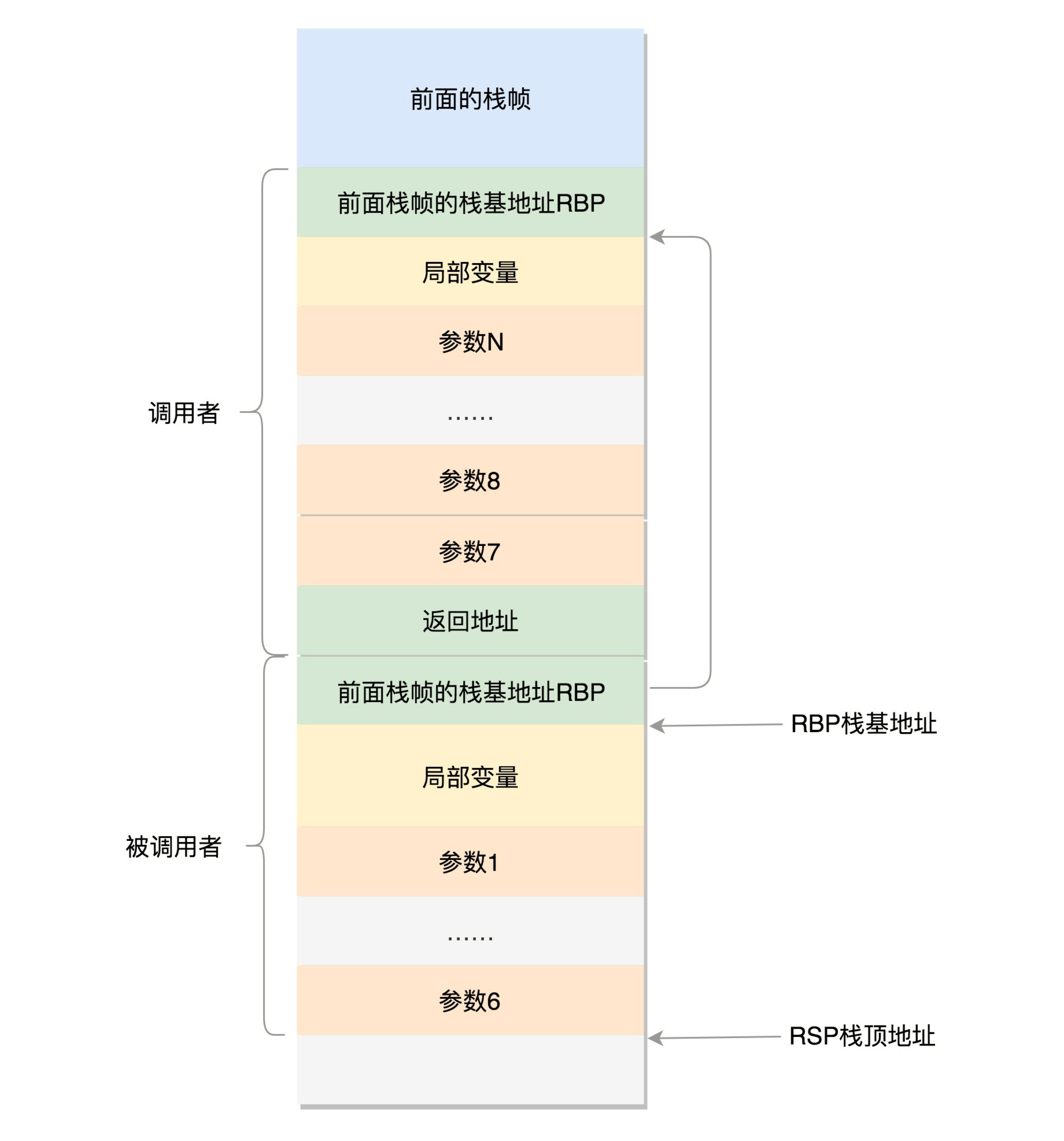 然而,前6个参数有时候需要进行寻址,但是如果在寄存器里面,是没有地址的,因而还是会放到栈里面,只不过放到栈里面的操作是被调用函数做的。