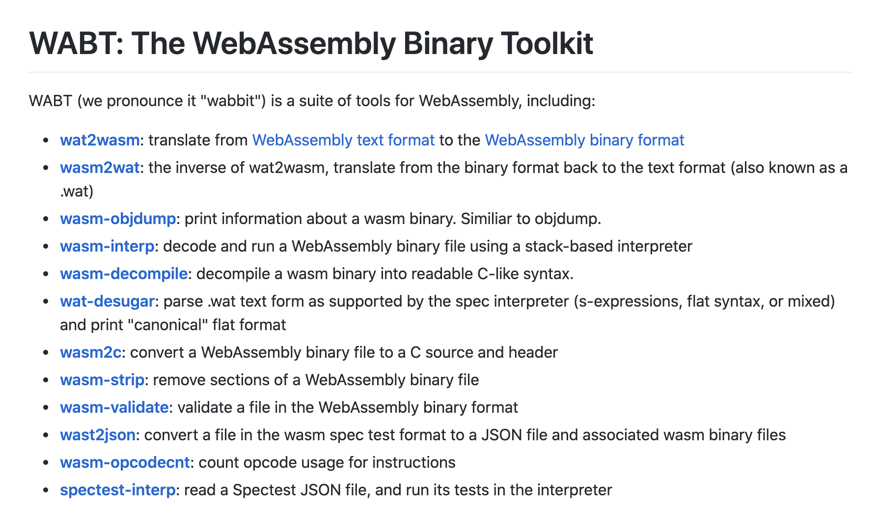 对于其他的 Wasm 相关调试工具,这里主要推荐你使用 “WABT” 。关于这个工具集,我在文章 [06] 中曾提到过。WABT 内置了众多可以直接对 Wasm 字节码或者 WAT 可读文本代码进行转换和分析的工具。比如用于将 WAT 格式转换为 Wasm 字节码的工具 “wat2wasm”、用于将 WAT 转换为 Flat-WAT 的工具 “wat-desugar” 等等。