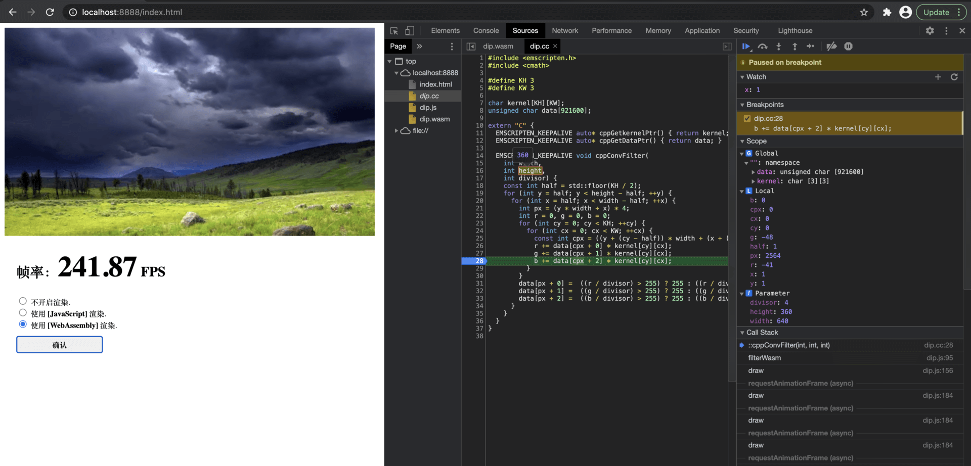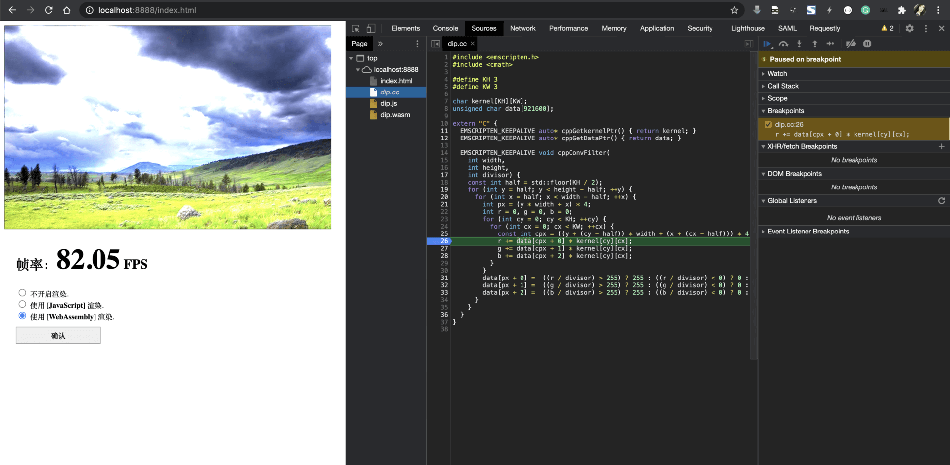 不仅如此,在 “-g4” 这个级别下,emcc 还会为我们生成可用于在 Web 浏览器中进行“源码级”调试的特殊 DWARF 信息。通过这些特殊格式的信息,我们便可以直接在 Web 浏览器中对 Wasm 模块编译之前的源代码进行诸如“设置断点”、“单步跟踪”等调试手段。如下所示,假设此时我们使用该参数重新编译上一节课中的 DIP Web 应用。
