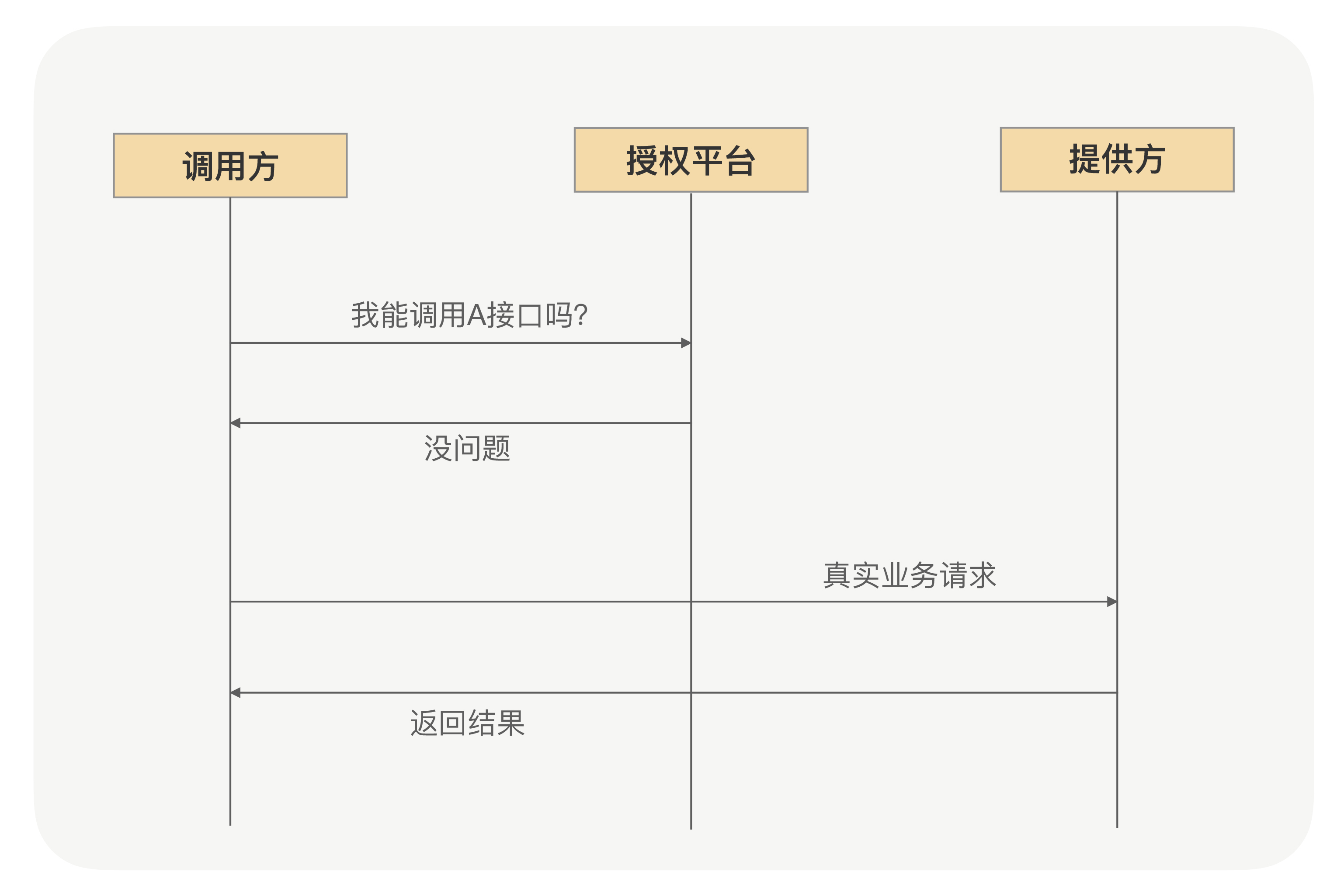 既然有了刚搭建的授权平台,而且接口的授权数据也在这个平台上,我们自然就很容易想到是不是可以把这个检票的环节放到这个授权平台上呢?调用方每次发起业务请求的时候先去发一条认证请求到授权平台上,就说:“哥们儿,我能调用这个接口吗?”只有授权平台返回“没问题”后才继续把业务请求发送到服务提供方那去。整个流程如下图所示: