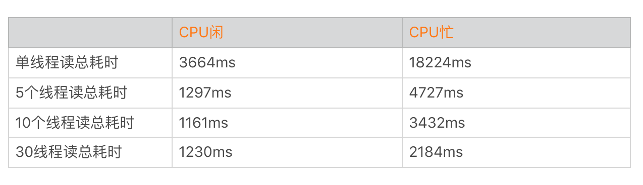 你可以发现多线程在I/O操作上收益并没有那么大,总时间从3.6秒减少到1.1秒。因为CPU的性能相比磁盘来说就是火箭,I/O操作主要瓶颈在于磁盘带宽,30条线程并不会有30倍的收益。而线程数太多甚至会导致耗时更长,表格中我们就发现30个线程所需要的时间比10个线程更长。但是在CPU繁忙的时候,更多的线程会让我们更有机会抢到时间片,这个时候多线程会比单线程有更大的收益。