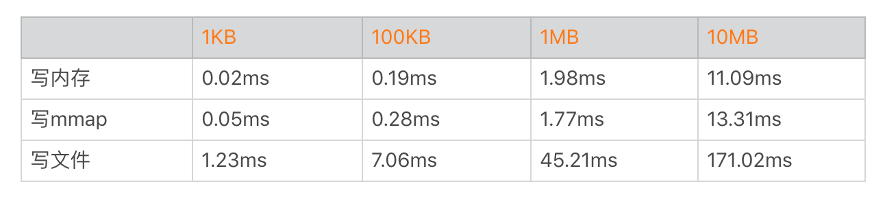 从上面的数据看起来mmap好像的确跟写内存的性能差不多,但是这并不正确,因为我们并没有计算文件系统异步落盘的耗时。在低端机或者系统资源严重不足的时候,mmap也一样会出现频繁写入磁盘,这个时候性能就会出现快速下降。
