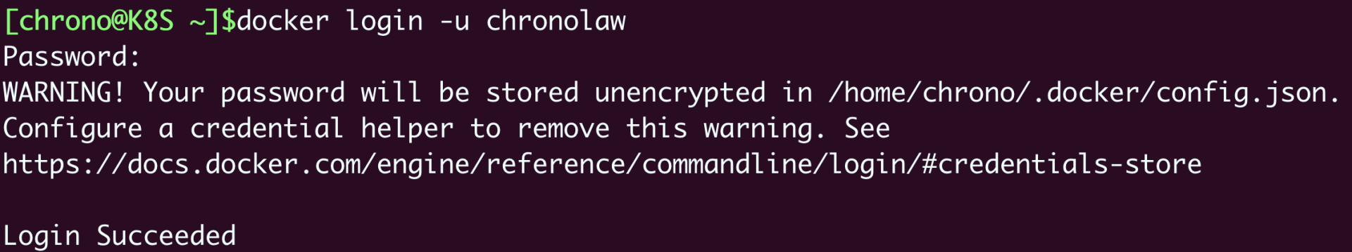 第二步,你需要在本机上使用 docker login 命令,用刚才注册的用户名和密码认证身份登录,像这里就用了我的用户名“chronolaw”: