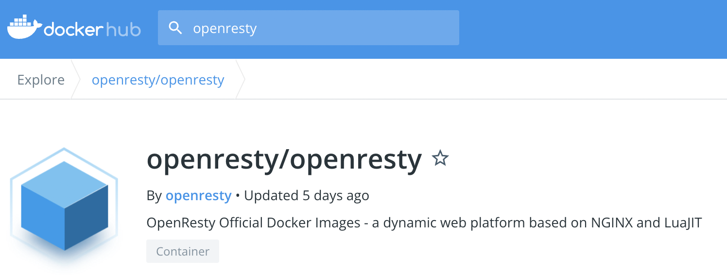 下面的这张截图就是OpenResty在Docker Hub上的搜索结果。可以看到,有两个认证发行商的镜像(Bitnami、IBM),但下载量都很少,还有一个“民间”镜像下载量虽然超过了1M,但更新时间是3年前,所以毫无疑问,我们应该选择排在第三位,但下载量超过10M、有360多个星的“半官方”镜像。