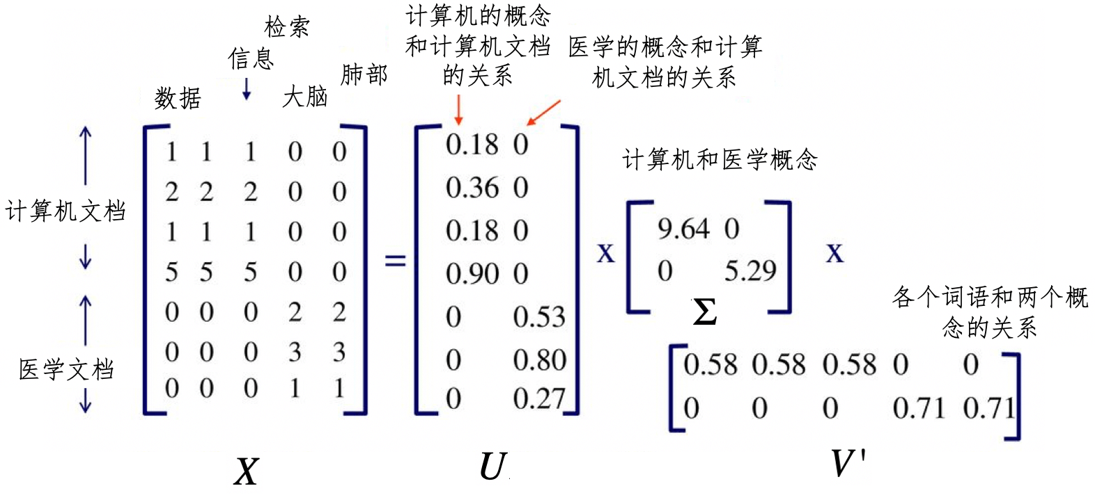 在这张图中,我们有一个7×5维的矩阵$X$,表示7个文档和5个单词。经过SVD分解之后,我们得到了两个主要的语义概念,一个概念描述了计算机领域,另一个概念描述了医学领域。矩阵U描述文档和这两个概念之间的关系,而矩阵$V’$描述了各个词语和这两个概念之间的关系。如果要对文档进行检索,我们可以使用$U$这个降维之后的矩阵,找到哪些文档和计算机领域相关。同样,对于聚类算法,我们也可以使用U来判断哪些文档属于同一个类。