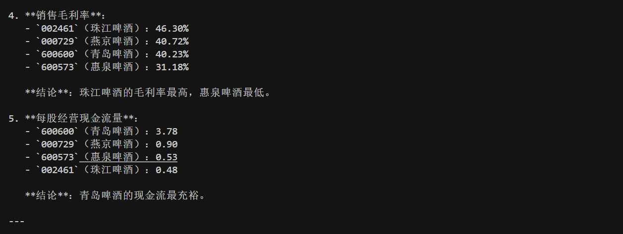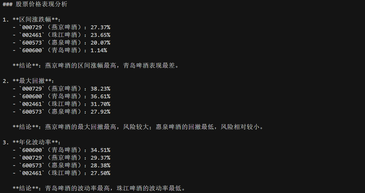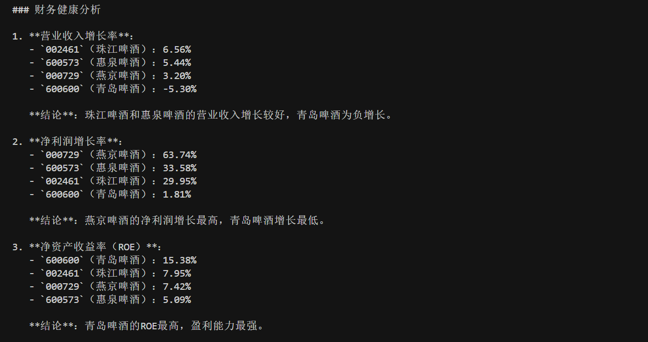 最后,我们来测试一下效果。我选取了啤酒板块的四只股票进行测试,分别是 600600 青岛啤酒,002461 珠江啤酒,000729 燕京啤酒以及600573 惠泉啤酒。需要注意的是,在这里我不是给大家推荐股票,今天大模型的测试效果也不能作为最终的买卖决策,我们仅仅是学习与测试。