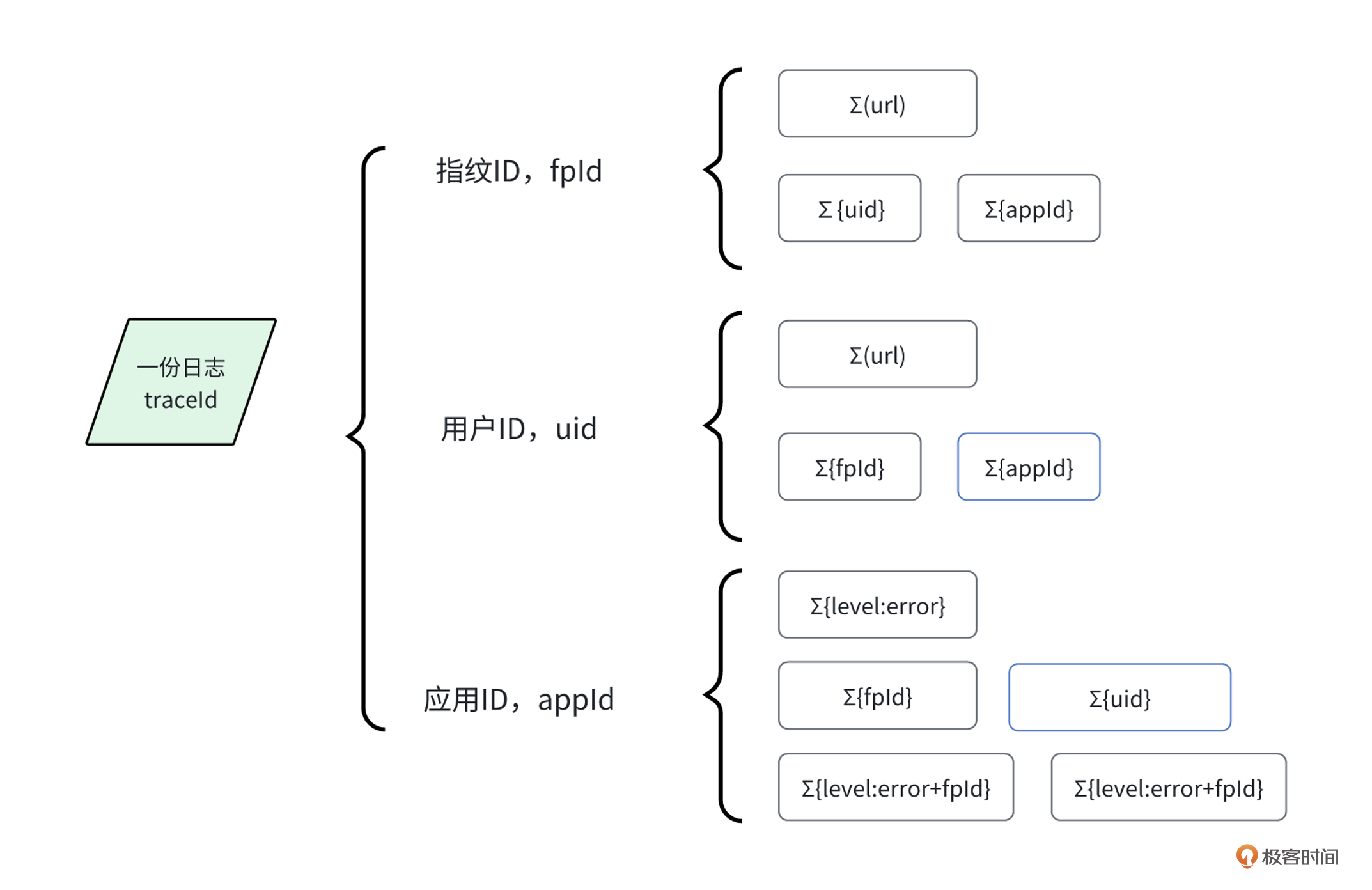 traceId 是日志ID,通过uuid生成,基本上接近唯一值。通过日志数据,我们能查询到 fpId 和 appId ,如果是已登录的用户,还会有 uid 。