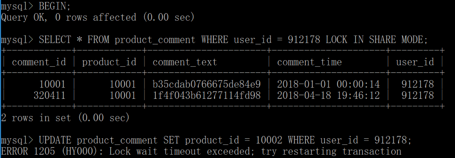 当对数据表加上共享锁的时候,该数据表就变成了只读模式,此时我们想要更新product_comment表中的数据,比如下面这样: