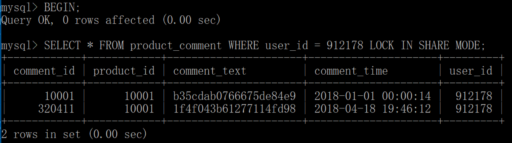 1 | SELECT comment_id, product_id, comment_text, user_id FROM product_comment WHERE user_id = 912178 FOR UPDATE; |