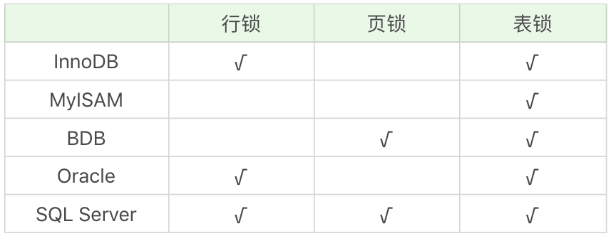 行锁、页锁和表锁是相对常见的三种锁,除此以外我们还可以在区和数据库的粒度上锁定数据,对应区锁和数据库锁。不同的数据库和存储引擎支持的锁粒度不同,InnoDB和Oracle支持行锁和表锁。而MyISAM只支持表锁,MySQL中的BDB存储引擎支持页锁和表锁。SQL Server可以同时支持行锁、页锁和表锁,如下表所示: