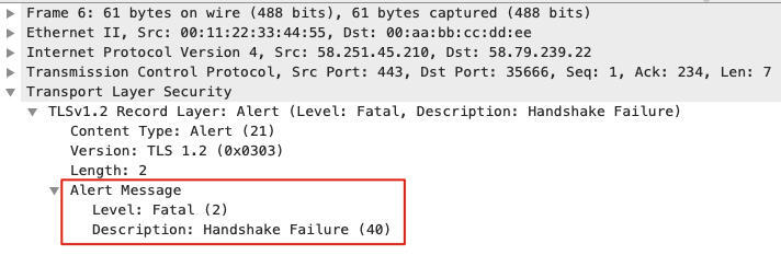 还真是“话不投机半句多”,客户端也就发了一个Client Hello报文,服务端就回复TLS Alert报文,结束了这次对话。那为啥聊不起来呢?我们看一下这个Alert报文: