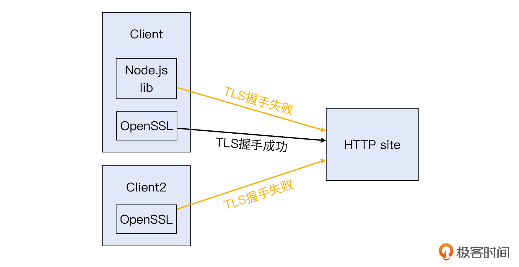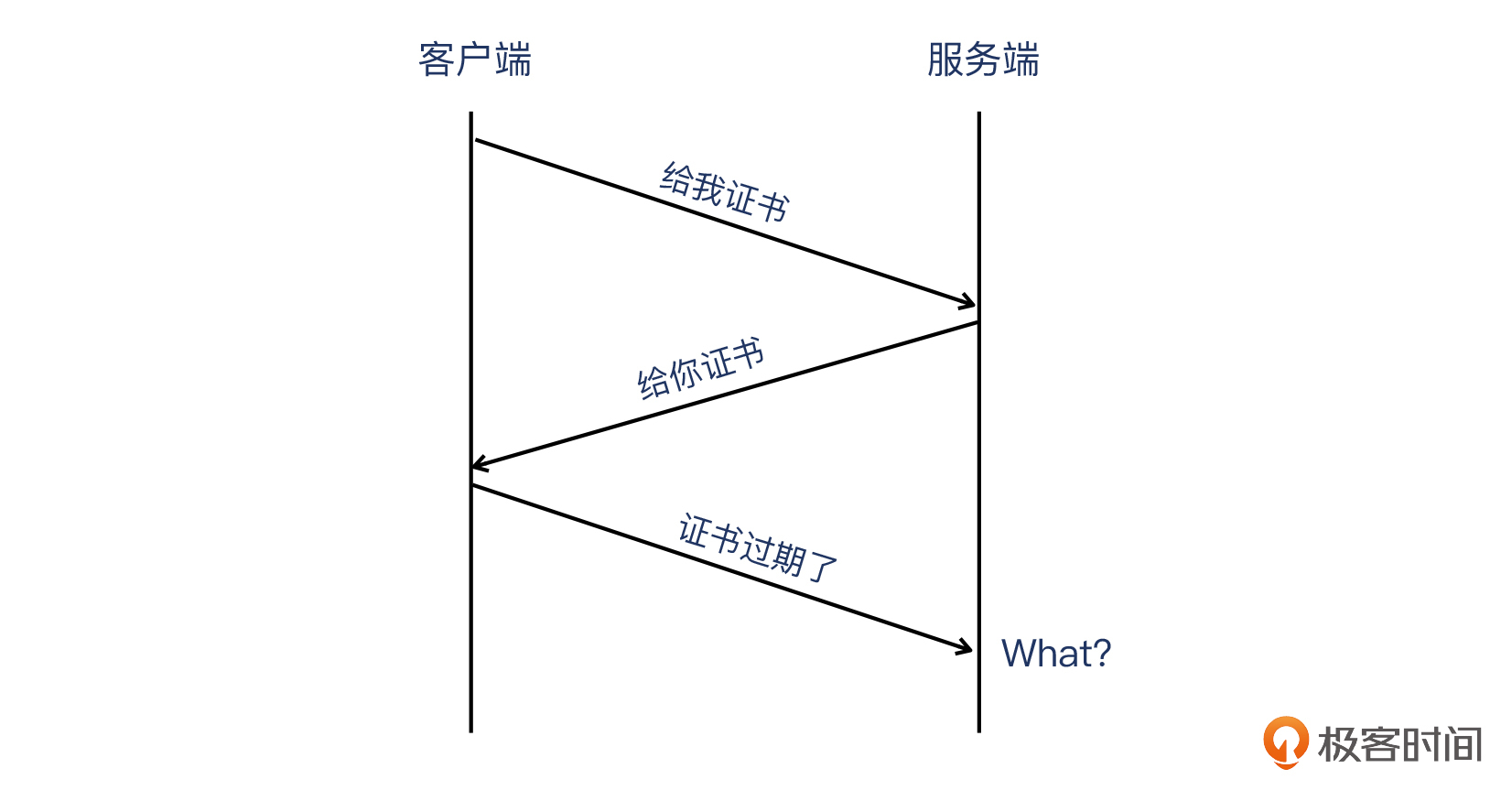 TLS握手失败,估计你也遇到过。引起这个问题的原因还是比较多的,比如域名不匹配、证书过期等等。不过,这些问题一般都可以通过“忽略验证”这个简单的操作来跳过。比如,在浏览器的警告弹窗里点击“忽略”,就可以让整个TLS的过程继续下去。