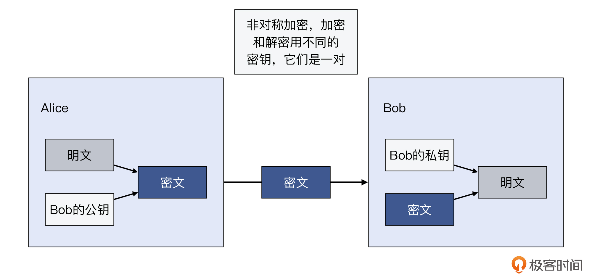 另外一类算法就是非对称算法,这也是PKI(公开密钥架构)的基础。在非对称算法中,加密和解密用了不同的密钥,这两个密钥形成了密钥对。比如Bob和Alice都各自生成了密钥对,然后互相交换了公钥。Alice用Bob的公钥对明文做了加密,变成密文传给Bob。Bob收到后,用自己的私钥解密,就还原出了明文。如下图所示: