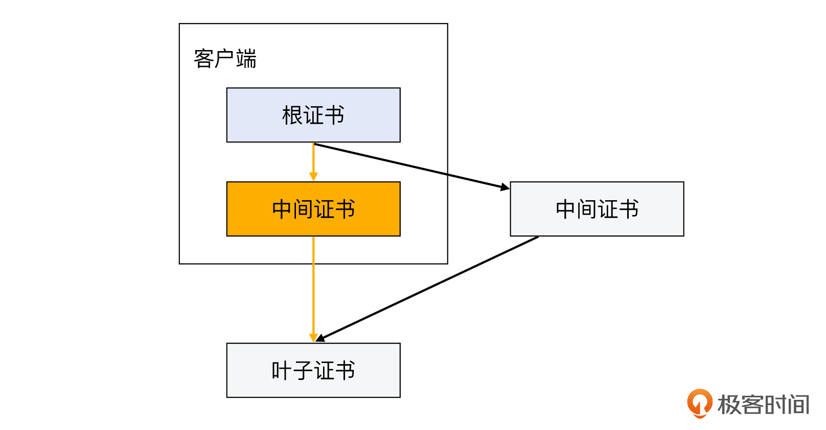 TLS证书验证是“链式”的机制。比如,客户端存有根证书和它签发的中间证书,那么由中间证书签发的叶子证书,就可以被客户端信任了,也就是这样一条信任链: