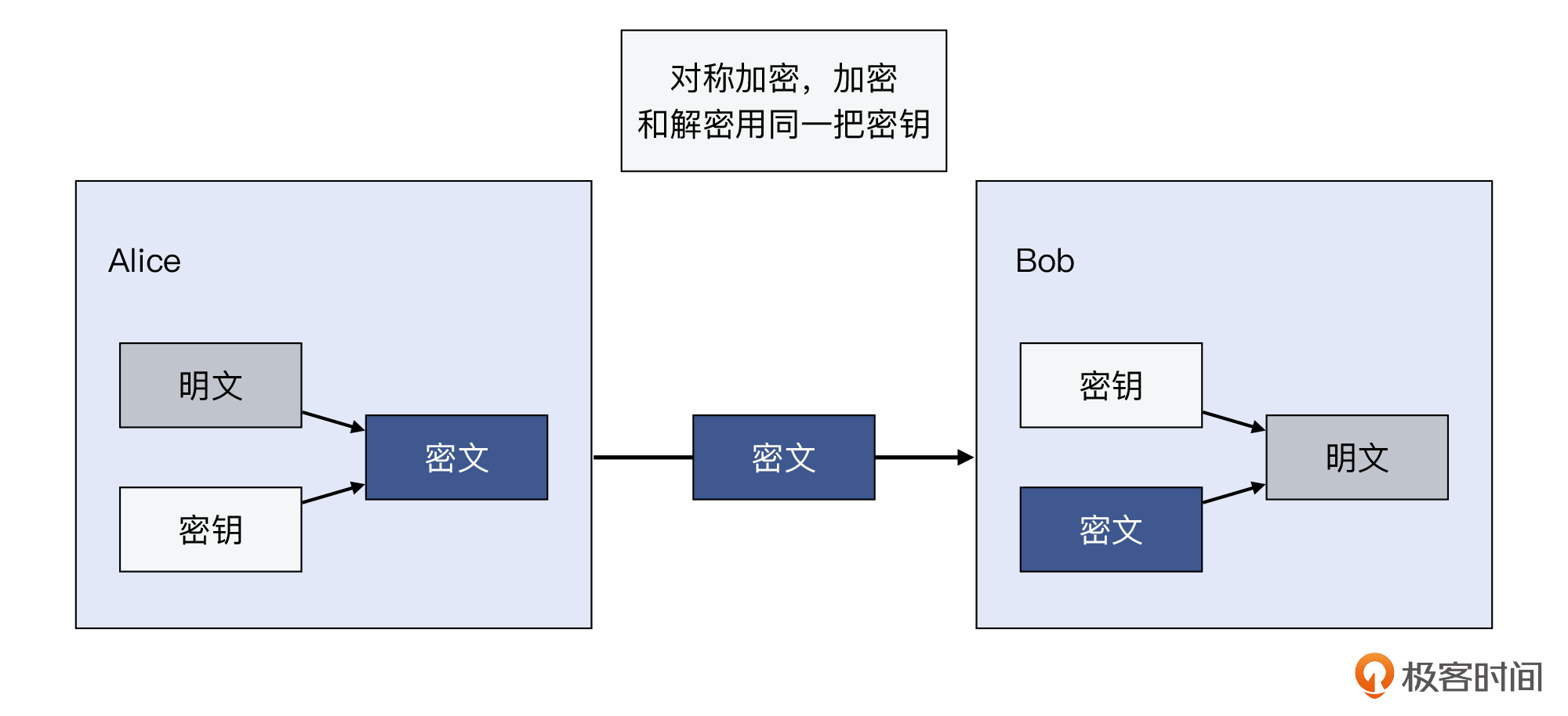 时间推进到现代,密码专家们已经开发出了众多优秀的对称加密算法,比如AES、DES。与木棒加密法类似,Alice和Bob都知道同一把密钥,Alice用这个密钥做加密,Bob收到密文后,也是用这把密钥做解密,就得到了明文。如下图所示: