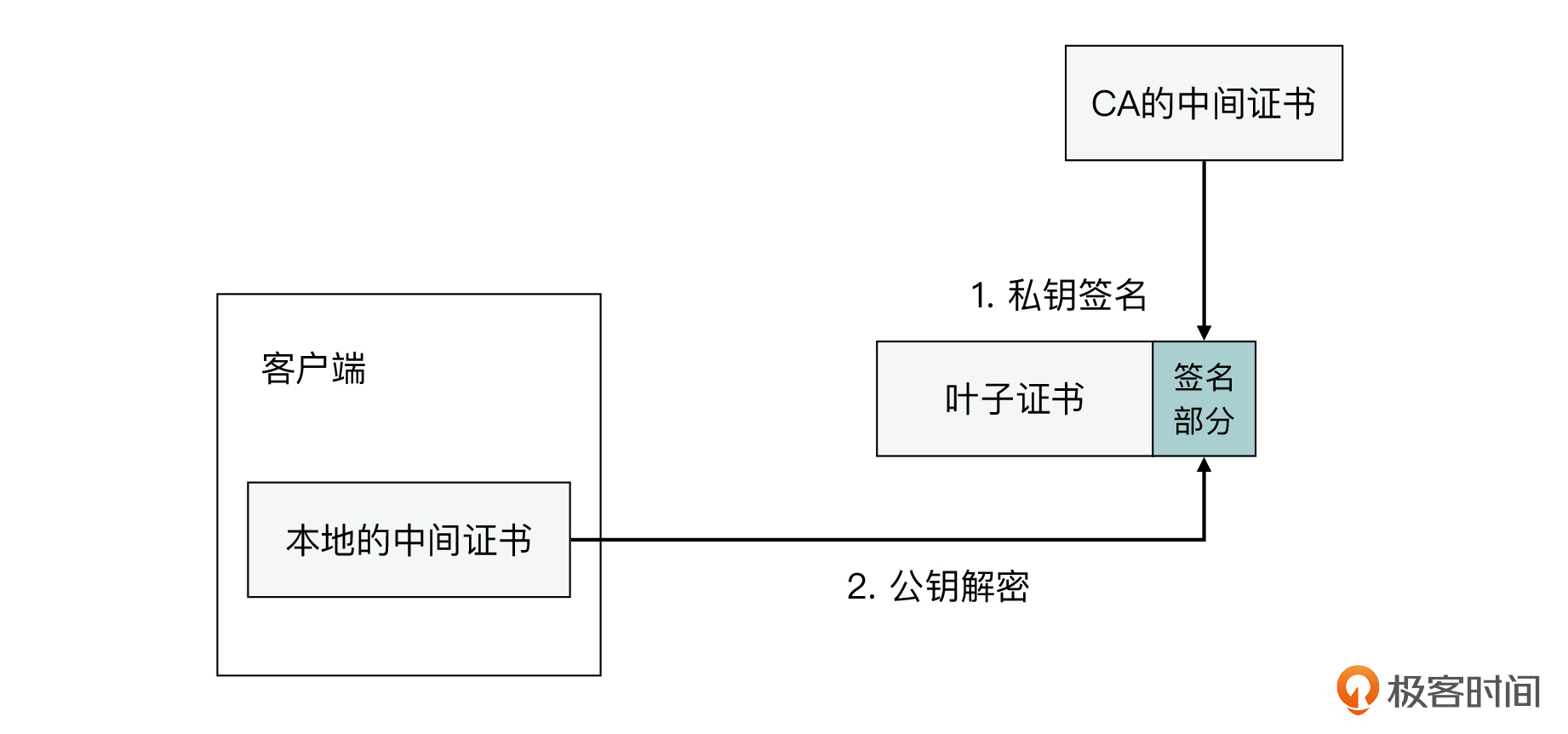 你应该也知道,TLS证书都有签名部分,这个签名就是用签发者的私钥加密的。客户端为什么会相信叶子证书真的是这个CA签发的呢?就是因为,客户端的Trust store里就有这个CA的公钥(在CA证书里),它用这个公钥去尝试解开签名,能成功的话,就说明这张叶子证书确实是这个CA签发的。