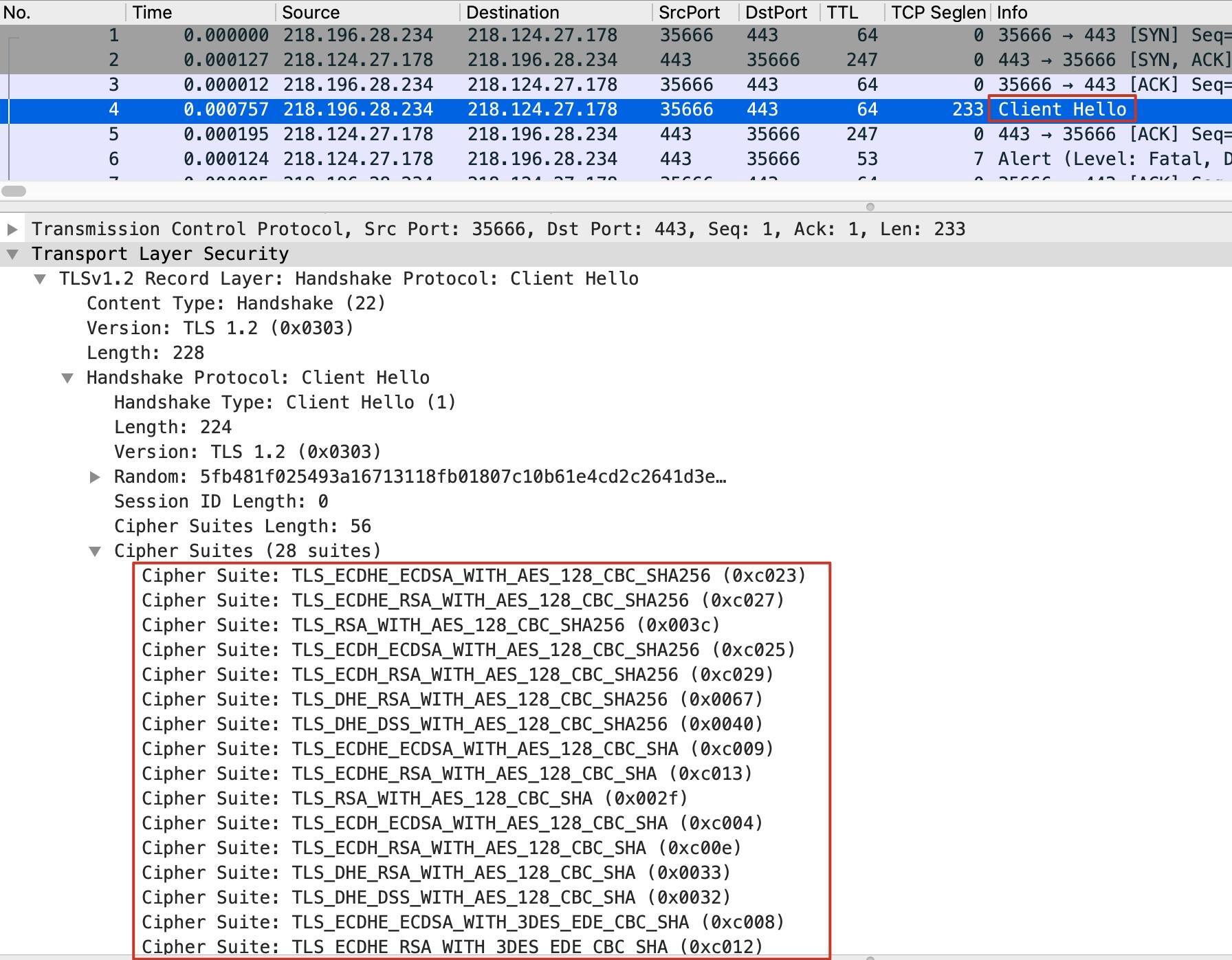 那么,我们怎么获得这个Java库能支持的密码套件列表呢?其实最直接的办法,还是用抓包分析。我们回到前面那个抓包文件,检查一下Client Hello报文。在那里,就有Java库支持的密码套件列表。