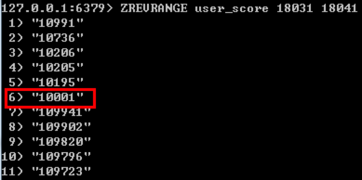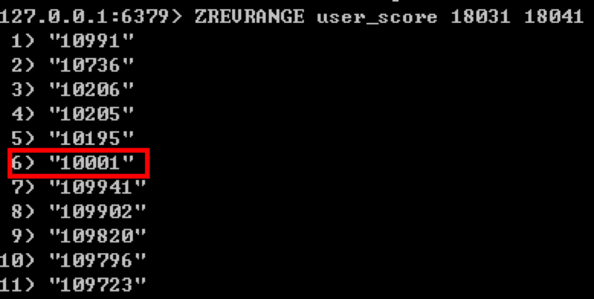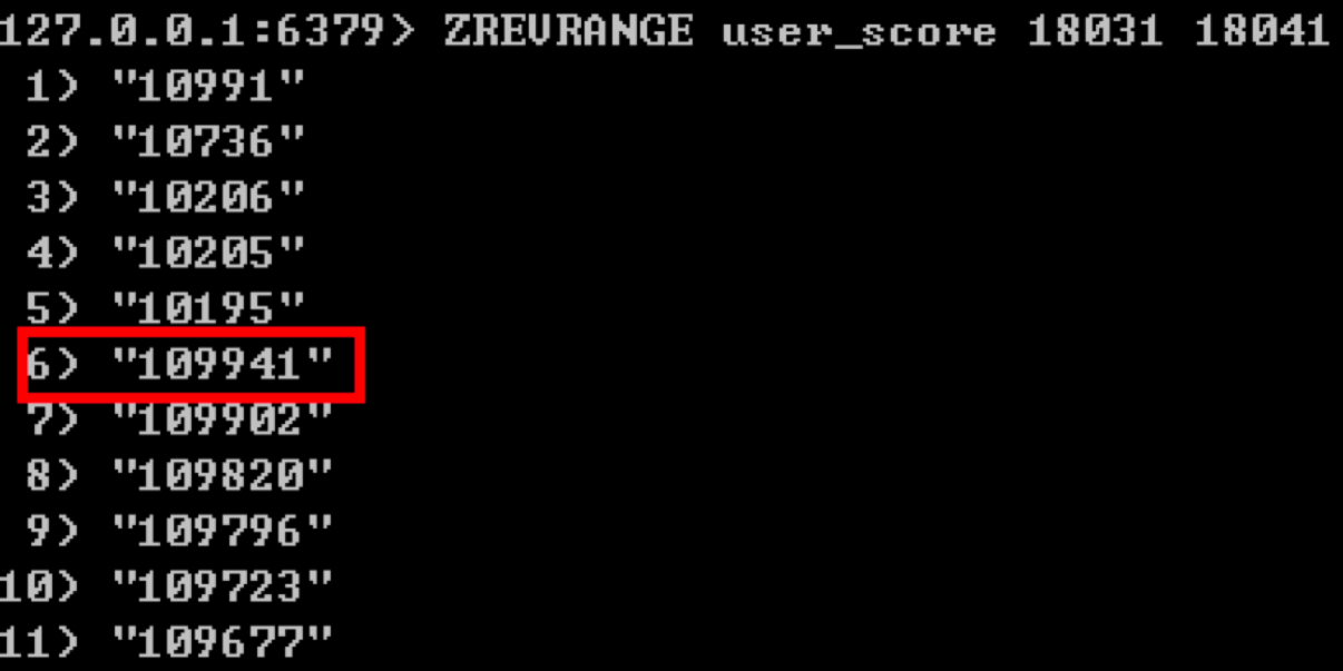 这样我们再来查询下排名在18031到18041的玩家是谁,使用:ZREVRANGE user_score 18031 18041。