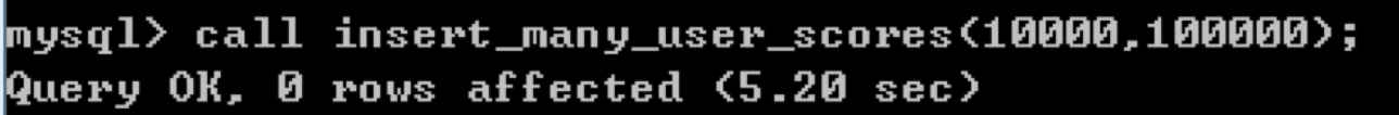 然后我们使用call insert_many_user_scores(10000,100000);模拟生成10万名玩家的得分数据。注意在insert之前,需要先设置autocommit=0,也就是关闭了自动提交,然后在批量插入结束之后再手动进行COMMIT,这样做的好处是可以进行批量提交,提升插入效率。你可以看到整体的用时为5.2秒。
