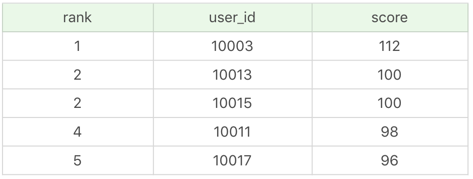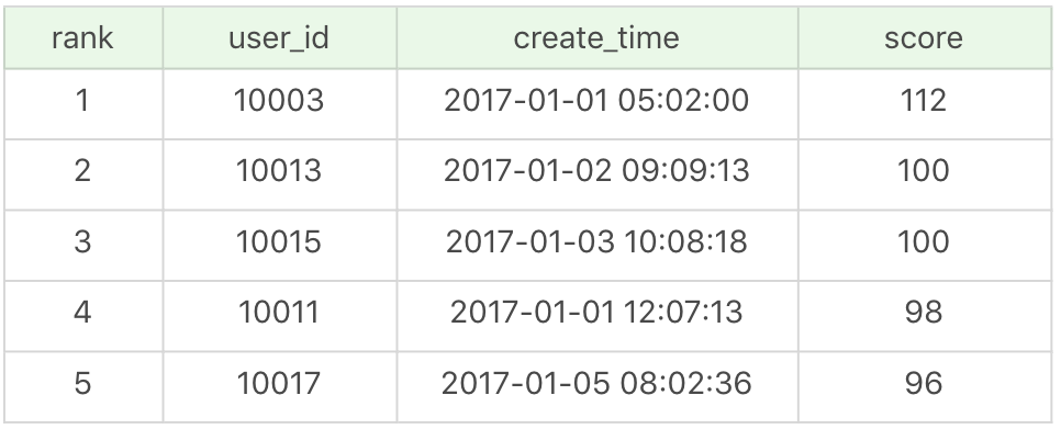 1 | SELECT (@rownum := @rownum + 1) AS user_rank, user_id, score, create_time |