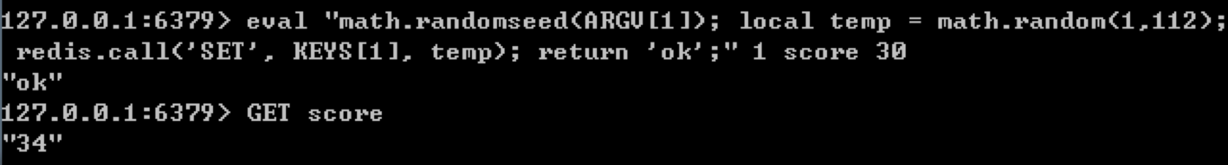 1 | eval "math.randomseed(ARGV[1]); local temp = math.random(1,112); redis.call('SET', KEYS[1], temp); return 'ok';" 1 score 30 |