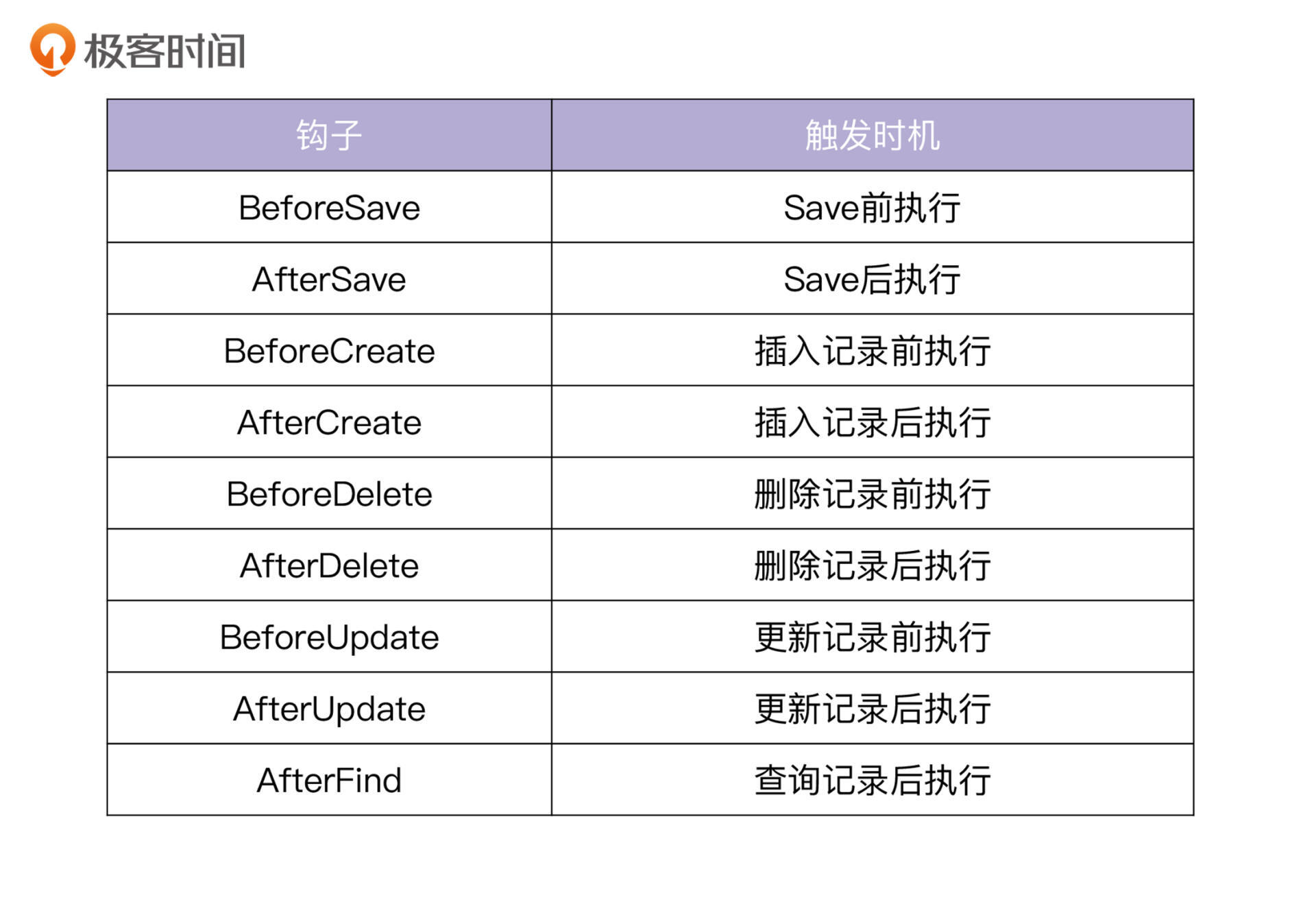 - 支持钩子方法。这些钩子方法可以应用在Create、Save、Update、Delete、Find方法中。