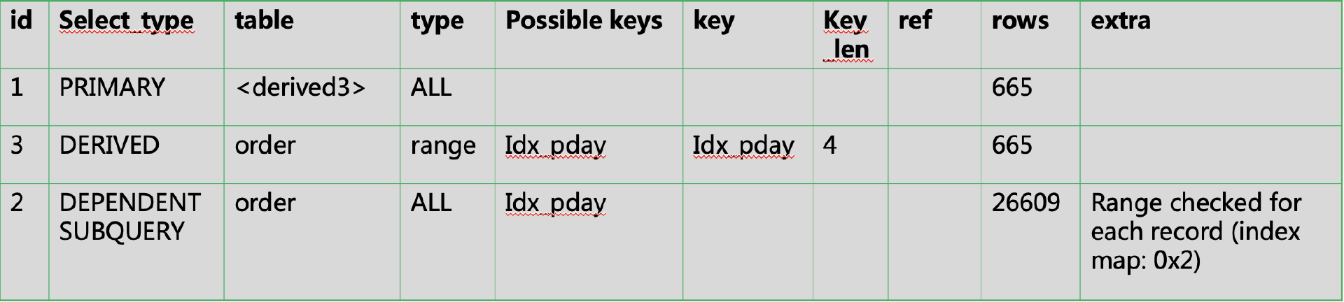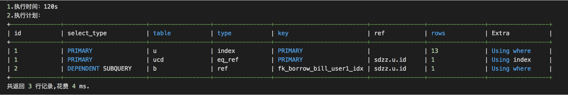 +----+--------------+-------------+--------+--------------------------+--------------+---------+---------------------+------+----------+---------------------------------+ | id | select_type | table | type | possible_keys | key | key_len | ref | rows | filtered | Extra | +----+--------------+-------------+--------+--------------------------+--------------+---------+---------------------+------+----------+---------------------------------+ | 1 | SIMPLE | <subquery2> | ALL | NULL | NULL | NULL | NULL | NULL | 100.00 | Using temporary; Using filesort | | 1 | SIMPLE | u | eq_ref | PRIMARY | PRIMARY | 4 | <subquery2>.user_id | 1 | 100.00 | NULL | | 1 | SIMPLE | ucd | ref | idx_userid | idx_userid | 4 | <subquery2>.user_id | 1 | 100.00 | Using where; Using index | | 2 | MATERIALIZED | b | range | idx_user_id,idx_borrowno | idx_borrowno | 123 | NULL | 10 | 100.00 | Using index condition | +----+--------------+-------------+--------+--------------------------+--------------+---------+---------------------+------+----------+---------------------------------+