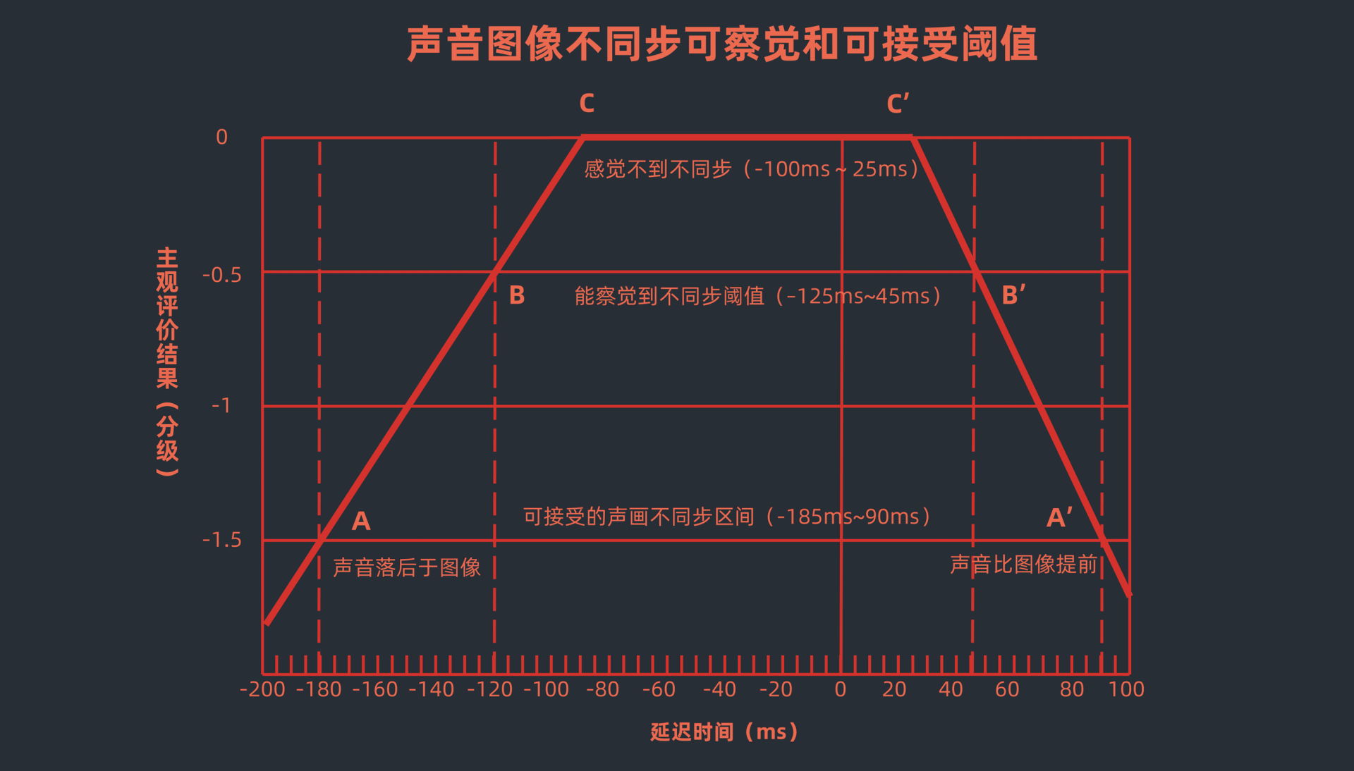 - 如果声音比图像延迟超过185ms,或者声音比图像提前超过90ms,人就已经不可接受了。