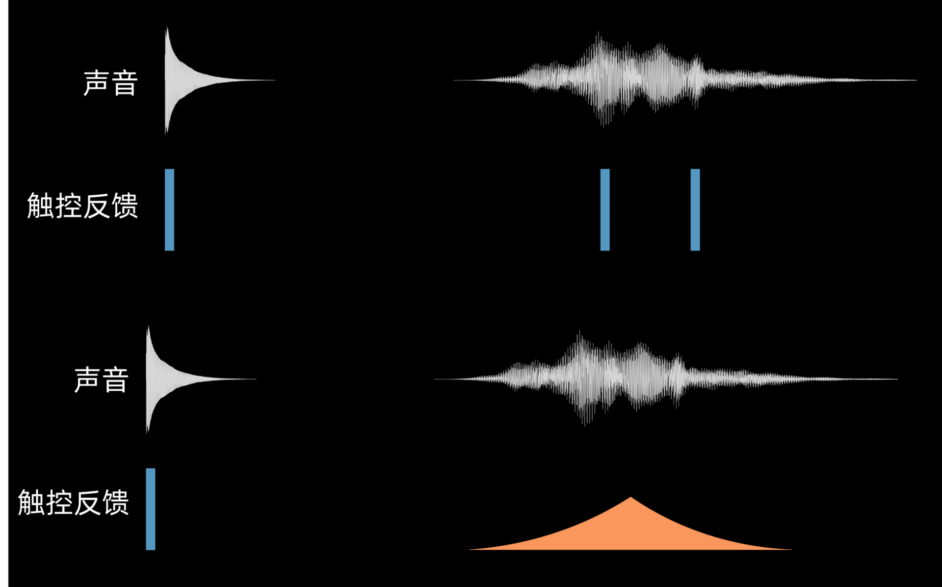 接下来我们谈谈声触协同。和视听、视触协同不同,在声触协同体验中,触控反馈的表现力远远低于听觉,所以如果你想通过触觉模拟声音的频率、音色的话,在很多时候是困难且没有必要的。