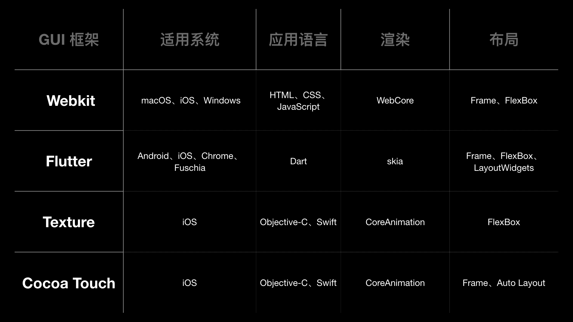 WebKit、Flutter、Texture这三个 GUI 框架,与Cocoa Touch的对比,如下图所示:
