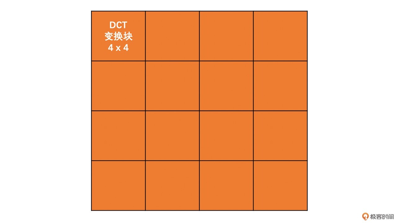 其实,通常情况下DCT变换是在4x4的子块上进行的(也可以在8x8子块上进行,但是只有在扩展profile才支持,由于原理是一样的,因此这里不再展开讨论),即便预测时并没有对宏块再做划分。也就是说,不管宏块有没有被划分到4x4的子块,我们在做DCT变换时,都是在一个个4x4块上进行的。如下图所示: