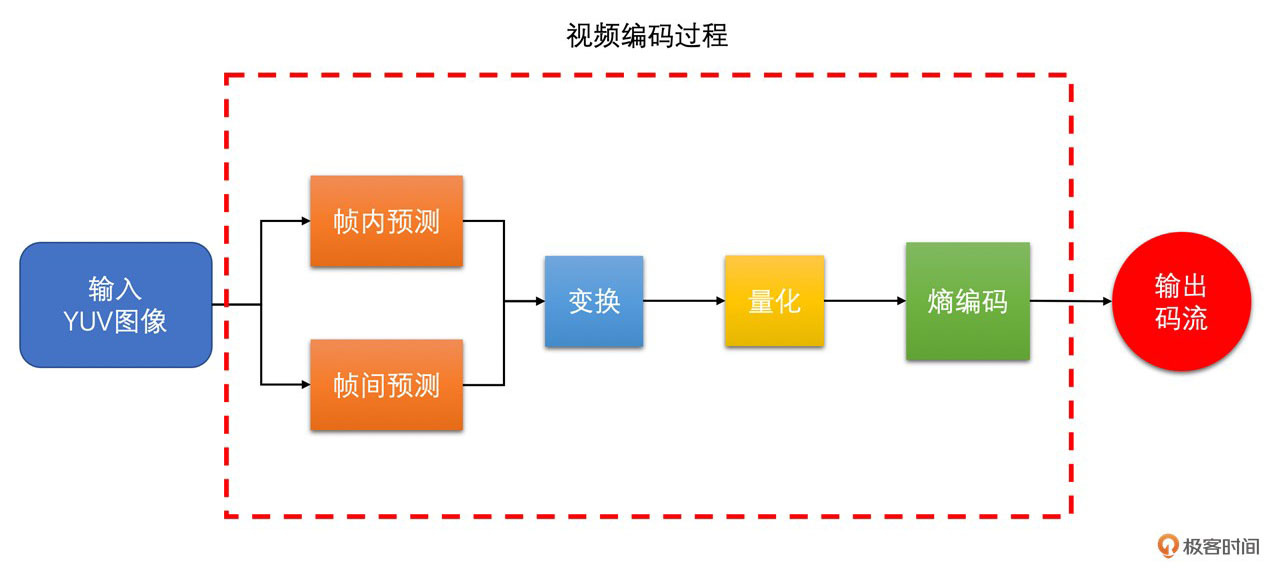 为了让你更透彻地了解视频编码中的DCT变换和量化的原理,在这节课里面,我们会对DCT变换和量化的过程做一个深入的探讨。通过下图你可以很清楚地看到视频编码的过程,并且能够更直观地感受DCT变换和量化在整个视频编码过程中的重要性。