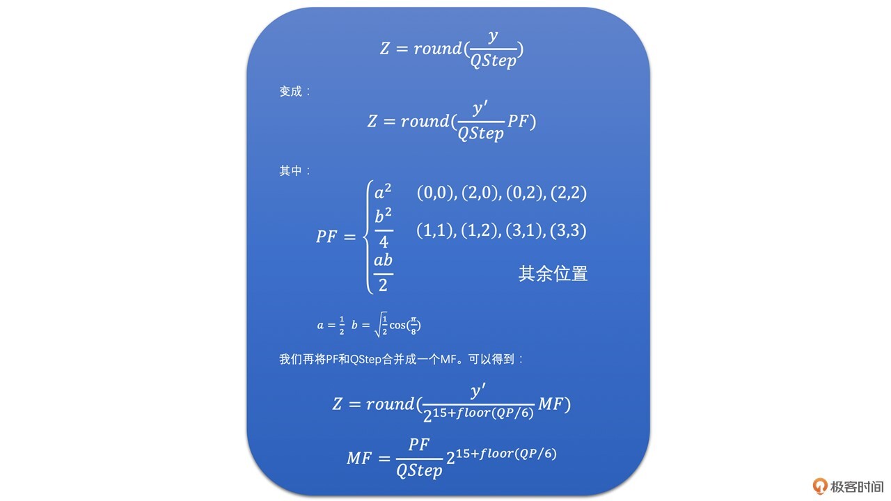 在前面整数变换里,DCT变换中的点乘部分被拿出来了,这一部分的计算被合并到了H264的量化过程中。因此H264的量化过程如下所示: