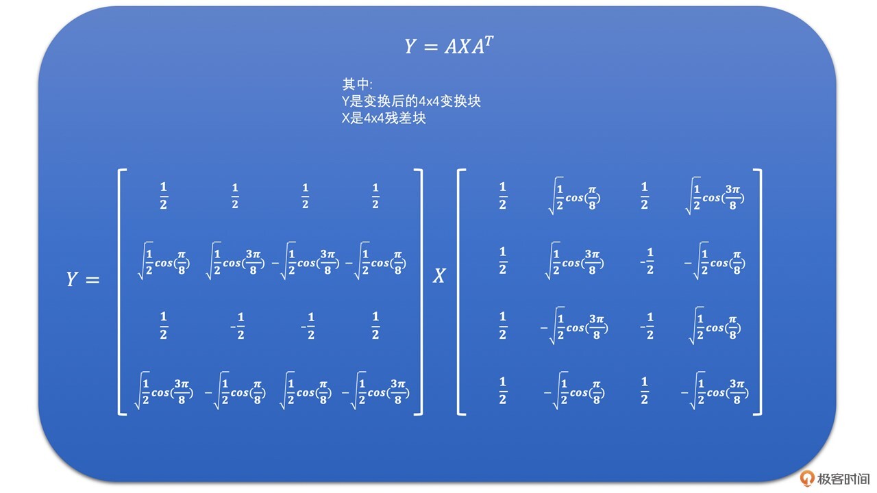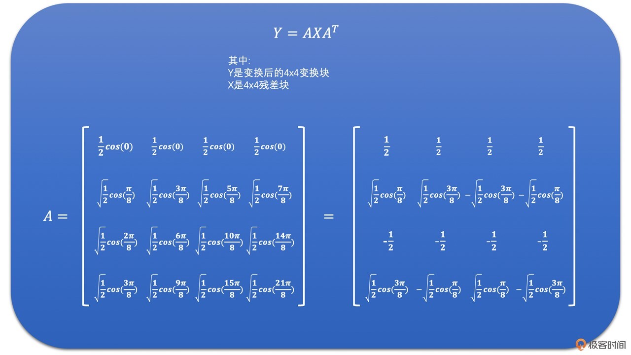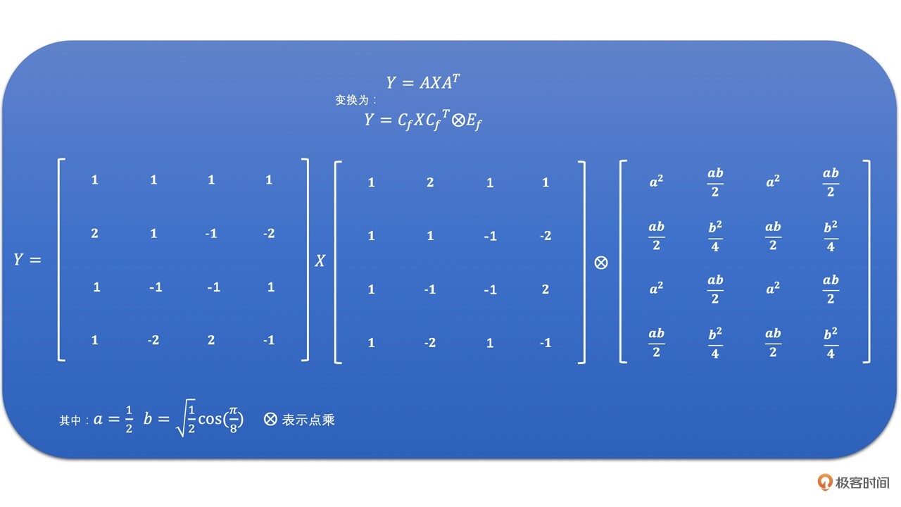 我们将点乘左边的部分取出来,就是H264中的整数变换了。公式如下: