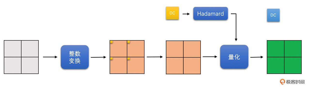 亮度16x16块,首先被划分成16个4x4的小块做整数变换。变换之后将16个4x4小块的DC系数都拿出来,组成一个4x4的DC块,再对这个4x4的DC块进行Hadamard变换。然后,再总体进行量化操作。