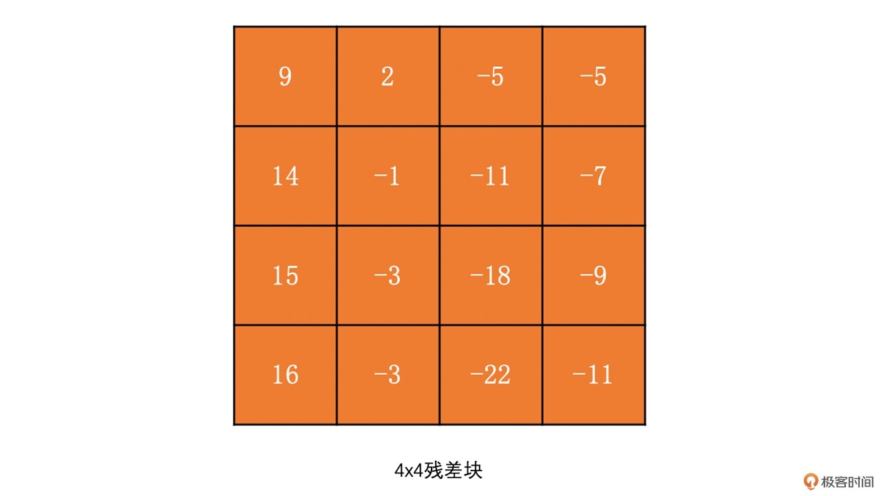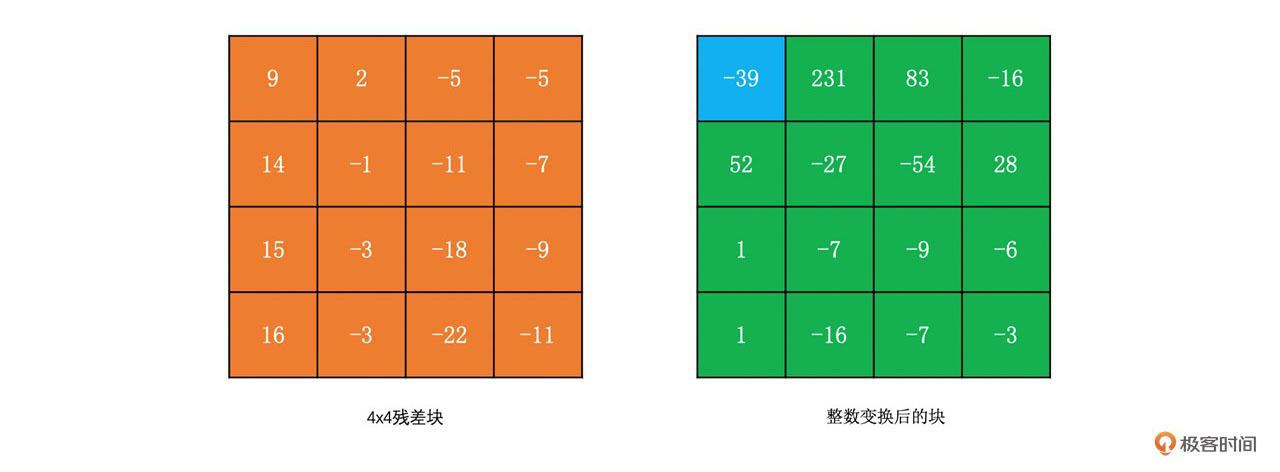 为了让你更好地理解DCT变换,我们通过下面的例子来看一下4x4的残差块的DCT变换结果。我们称左上角的系数为DC系数,而其它系数为AC系数。