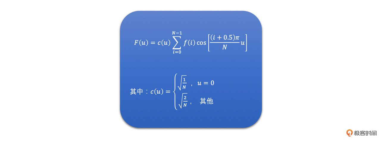 一维DCT变换公式如下,其中f(i)是指第i个样点的信号值,N代表信号样点的总个数。