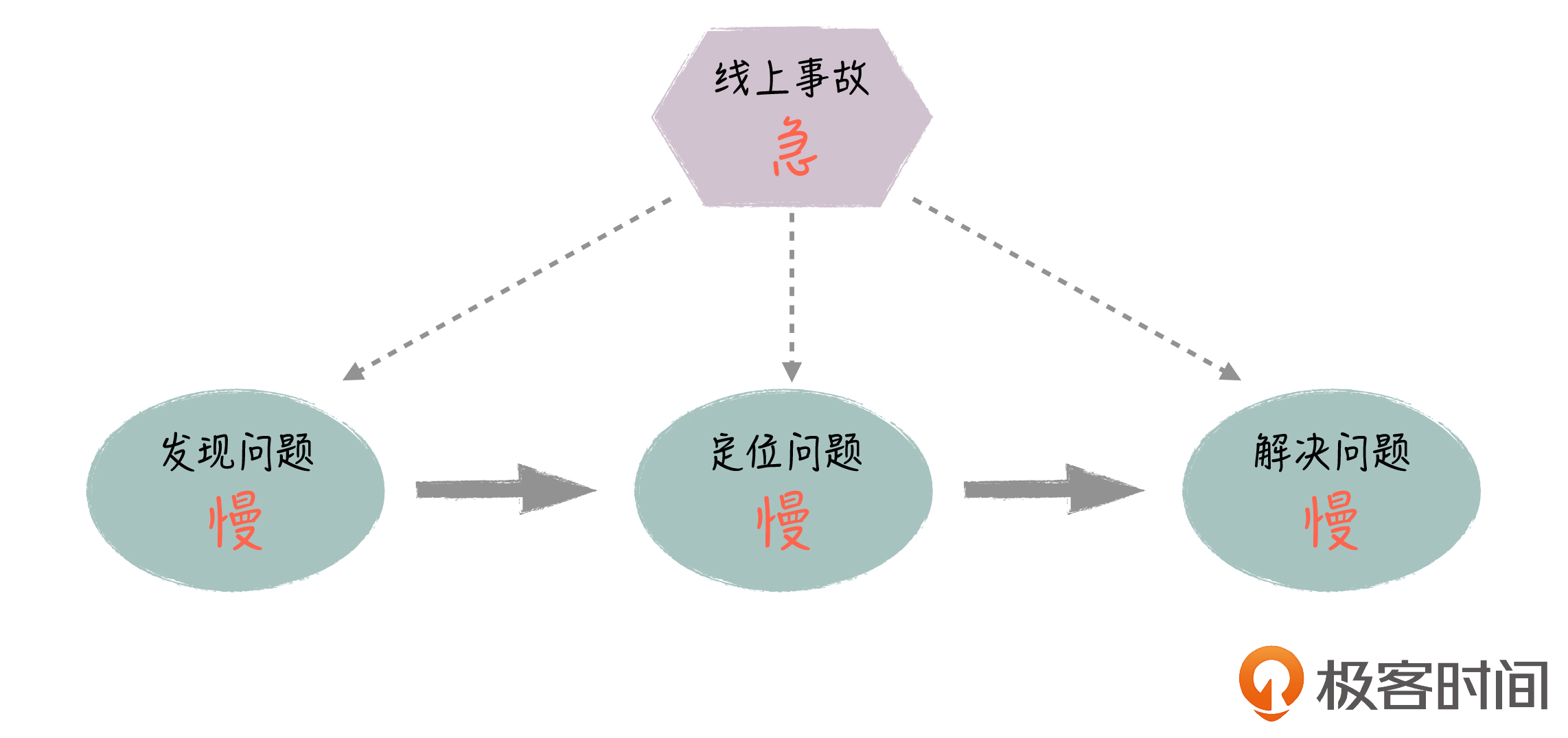 - **定位问题慢:**系统节点多,大量的人需要介入排查,而且由于节点依赖复杂,需要反复沟通才能把信息串起来,因此很多时候,这种排查方式是串行或者说无序的。一方面,无关的人会卷入进来,造成人员的浪费;另一方面排查效率低,定位问题的时间长。