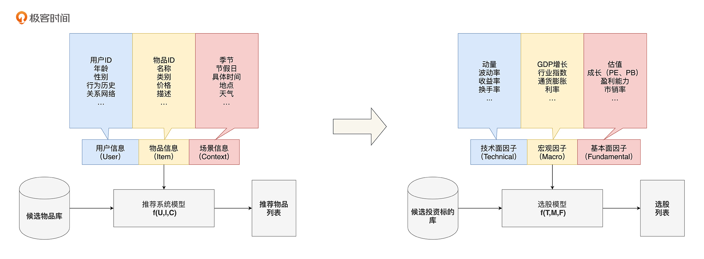 所以,利用机器学习解决投资问题的思路,其实和在互联网领域解决推荐、广告问题的思路是一样的,只不过利用的特征完全变了。如图1所示,推荐、广告模型利用的是用户的年龄、性别,物品的类别、价格等特征,投资领域的模型利用的是技术面因子、宏观因子、基本面因子等投资领域的特征。