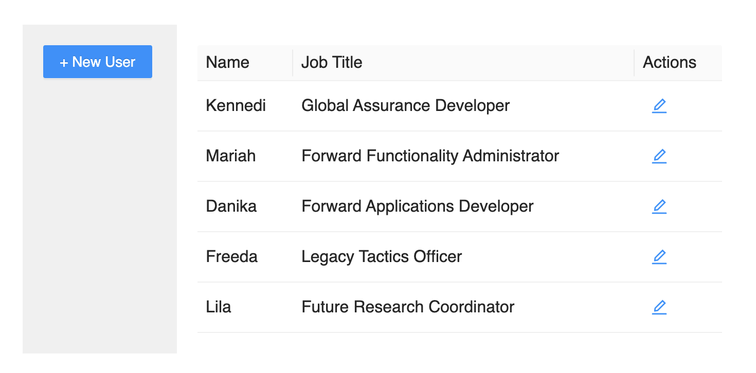 在这个例子中,我们有一个左右布局的页面。左边栏有一个新建用户的按钮,右边是一个用户列表。点击新建用户的按钮,或者点击表格中的编辑按钮,都会显示同一个对话框。这个对话框根据是否传入用户数据作为参数,来决定是新建还是编辑用户。