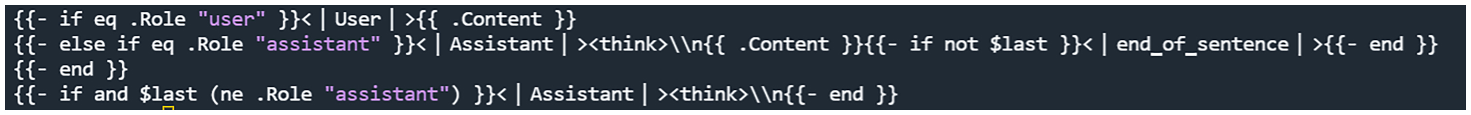 这是什么原因呢?我们使用如下命令看一下 deepseek-r1:32b 的聊天模板。