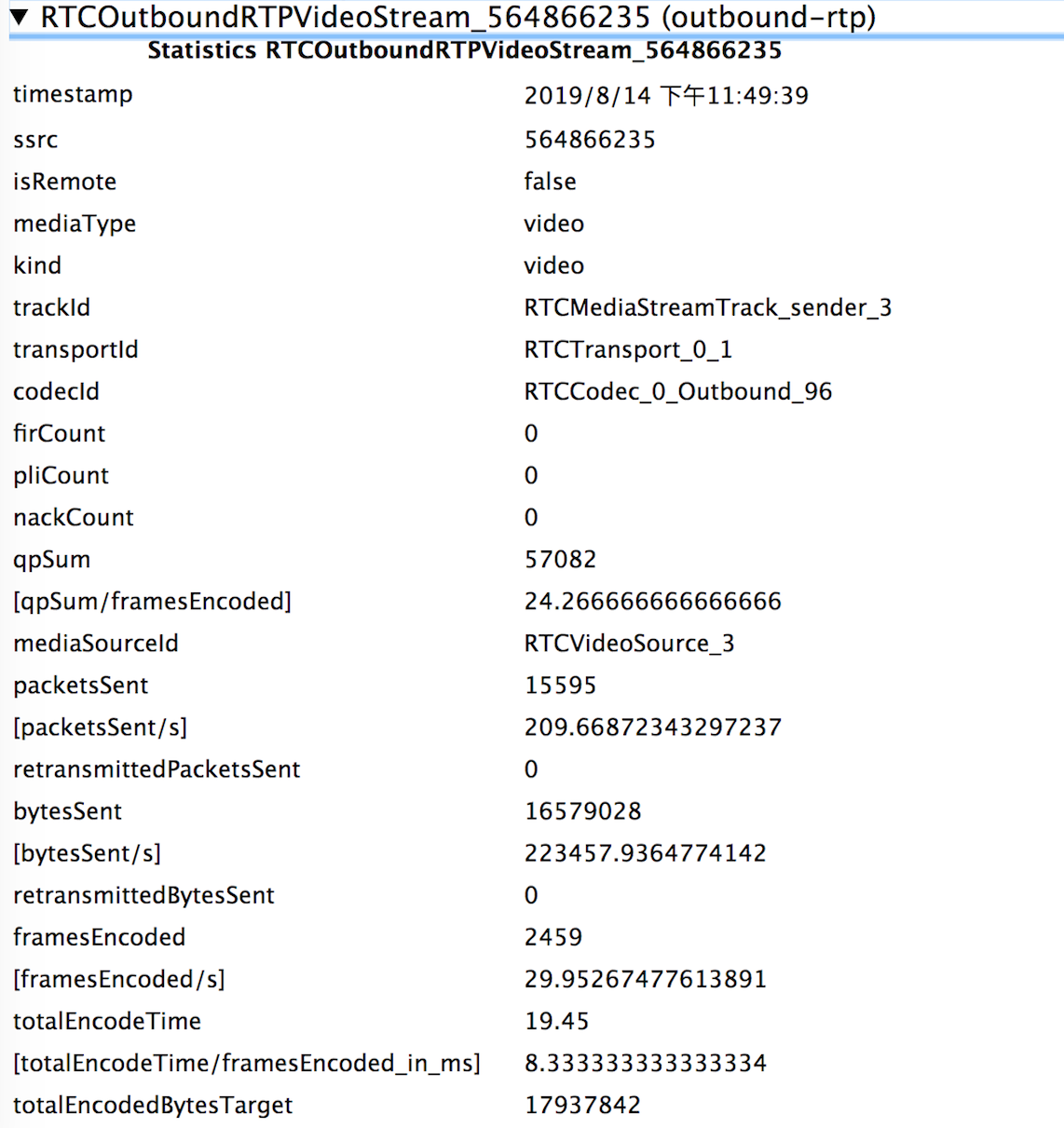 从这张图中你可以看到,在发送的视频轨信息中包括了 WebRTC 发送的总字节数、总包数、每秒钟发送的字节数和包数,以及重传的包数和字节数等信息。