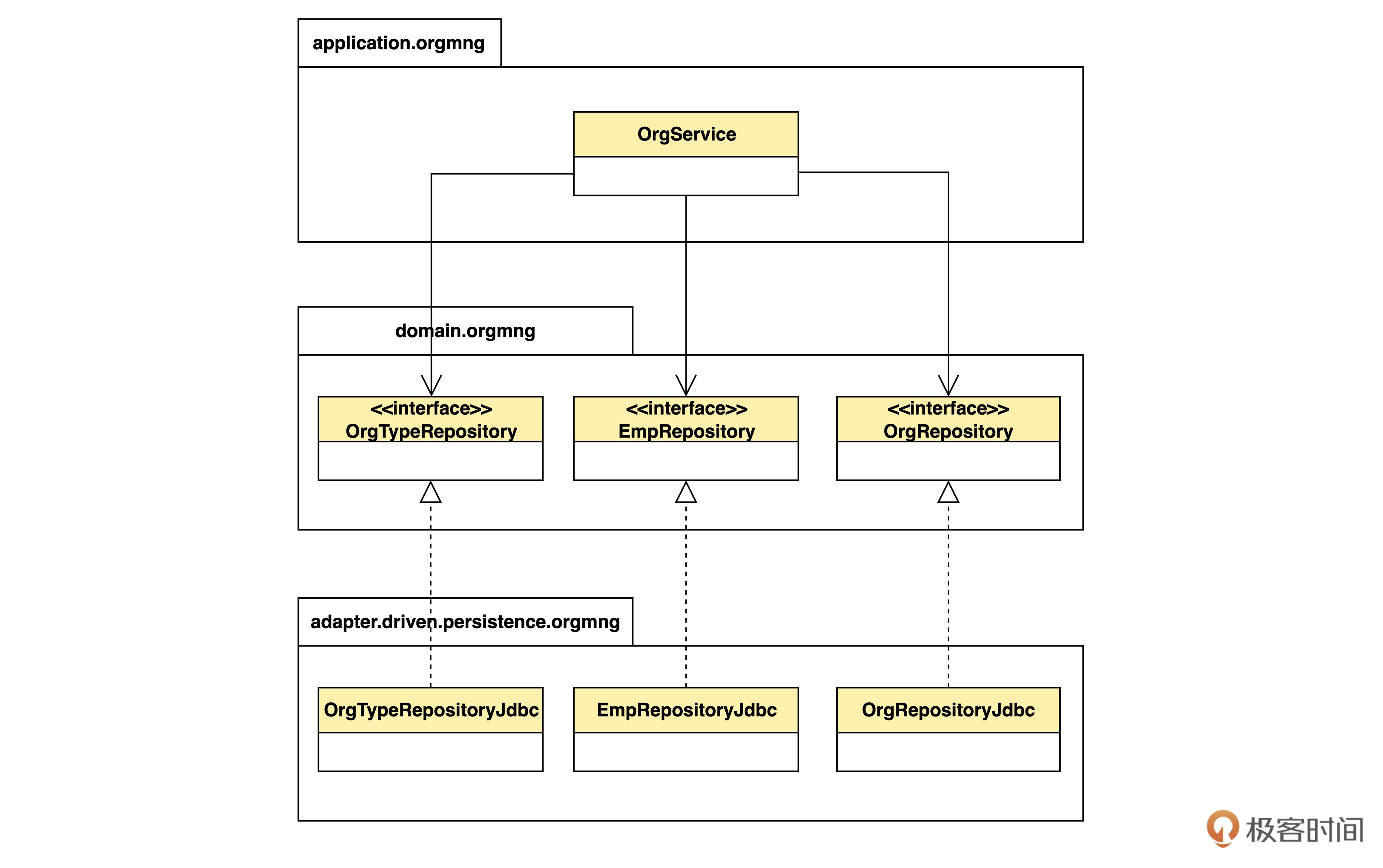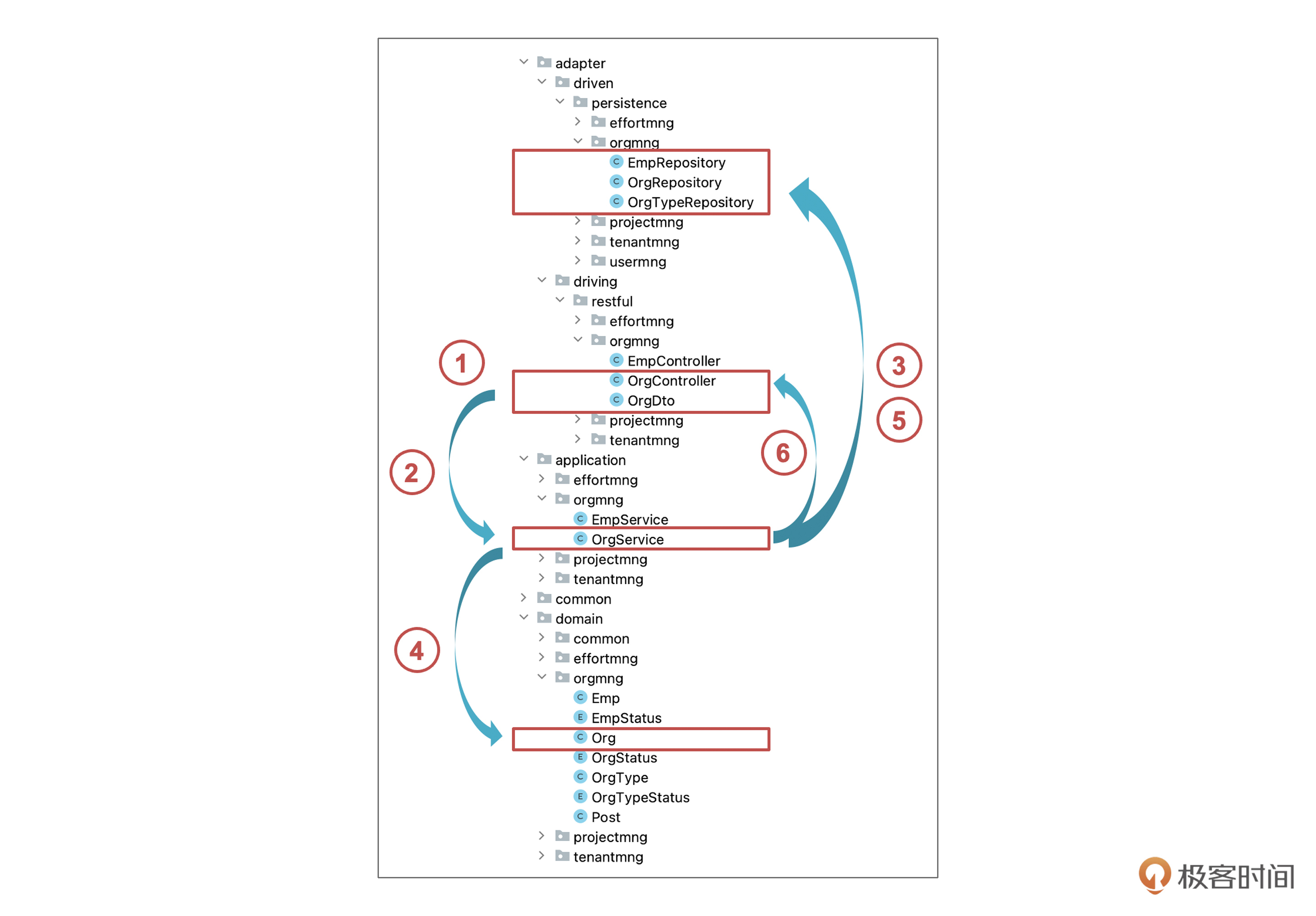 - 第三步,OrgService对参数进行校验,过程中会调用适配器层里的 Repository 来访问数据库。
