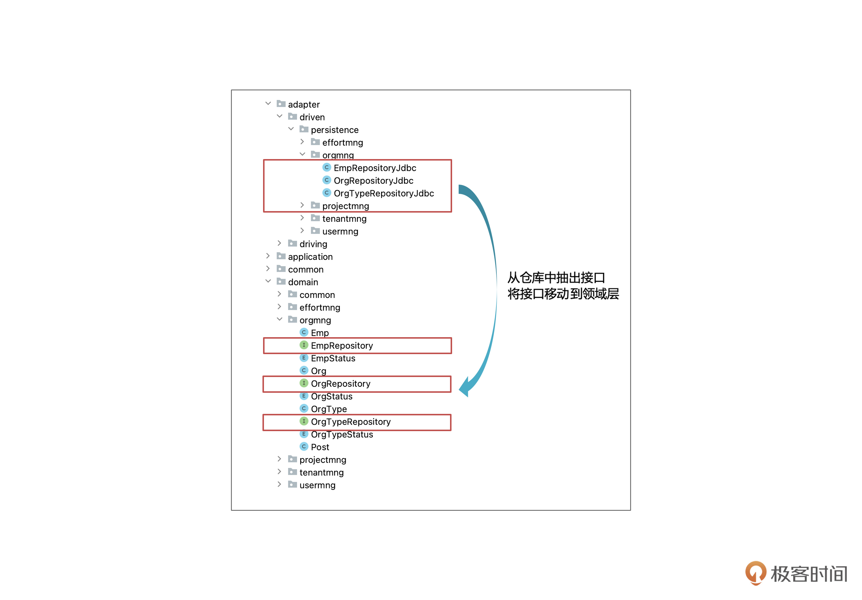 这时候我们该怎么办呢?像前面那样,把仓库移到应用层吗?可是仓库是适配器,就应该放在适配器层呀。这里就要用到一个技巧了,通过两步就可以解决.