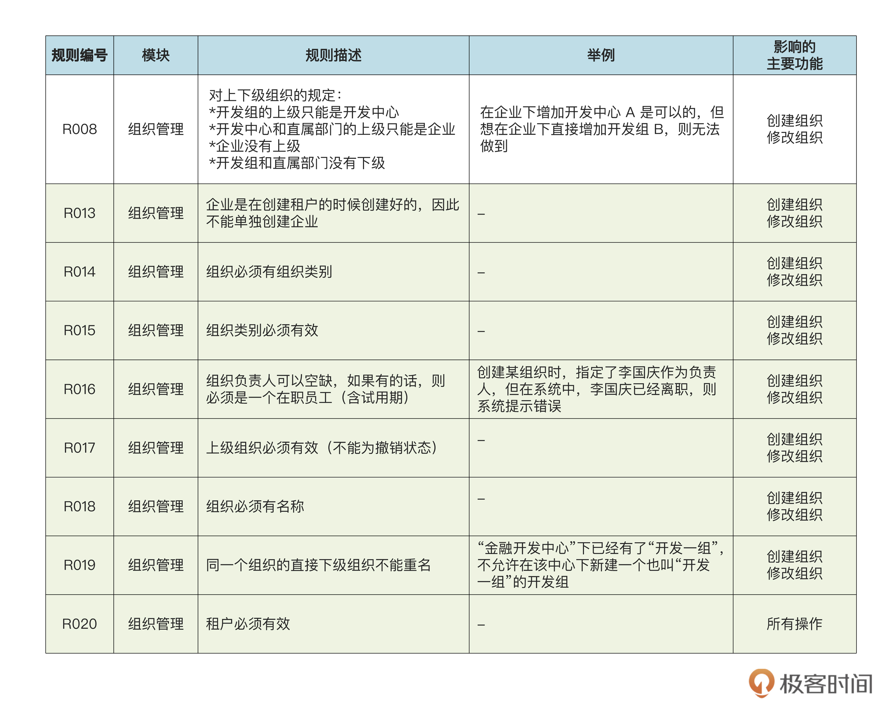 下面这张表,是和老王澄清需求以后整理的和“添加组织”有关的业务规则。其中绿色部分是这次新加的: