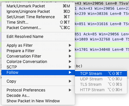 由于网络包的数量比较多,我们可以先过滤一下。比如,在选择一个包后,你可以单击右键并选择 “Follow” -> “TCP Stream”,如下图所示: