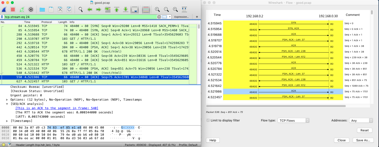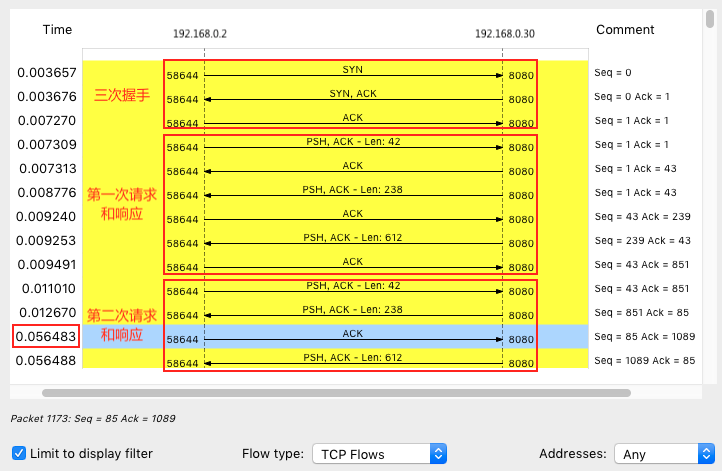 从这里,你可以看到这个 TCP 连接从三次握手开始的每个请求和响应情况。当然,这可能还不够直观,你可以继续点击菜单栏里的 Statics -> Flow Graph,选中 “Limit to display filter” 并设置 Flow type 为 “TCP Flows”: