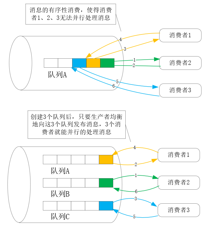 - 其次,当消费端性能不足需要扩容时,必须同步增加消息队列服务中的队列(在Kafka中叫做分区),才能允许新增的消费节点并行接收消息,提高消息的处理能力。否则,当多个消费者消费同一消息队列时,消息的有序性会导致多个消费节点串行处理消息,无法发挥出它们的全部性能,如下图所示: