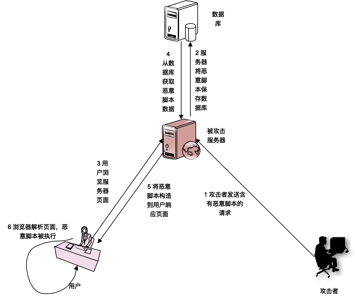 攻击者发送一个含有恶意脚本的请求给被攻击的服务器,比如通过发布微博的方式向微博的服务器发送恶意请求,被攻击的服务器将恶意脚本存储到本地的数据库中,其他的正常用户通过被攻击的服务器浏览信息的时候,服务器会读取数据库中含有恶意脚本的数据,并向其展现给正常的用户,在正常用户的浏览器上执行,从而达到攻击的目的。